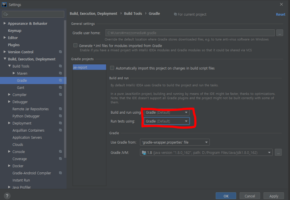 이렇게 기본으로 gradle 사용시 빌드 런, 테스트 시에 gradle을 사용하는 이유는 테스트와 배포시에 인텔리J에선느 정상적으로 동작 되었으나, 실 배포시에 배포되지 않는 현상을 없애기 위하여, 실 배포와 같은 환경을 구성해 주기 위함 이라고 한다.