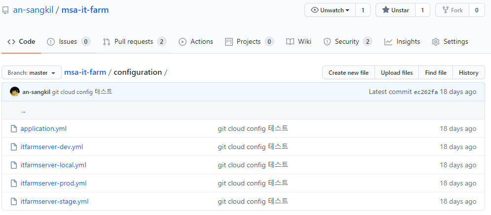 https://github.com/an-sangkil/msa-it-farm.git 경로에 있는 클라우드 컨피그 파일 을 생성한다. 기본적으로 application.yml 을 읽어 드리도록 되어 있다. 추후 spring-cloud-config-client 에서 이야기 하겠지만 ${application-name}-{profileactive}.yml 로 파일을 생성한다.