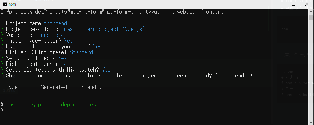 vue init webpack frontend 실행시 몇가지 설정을 물어본다.