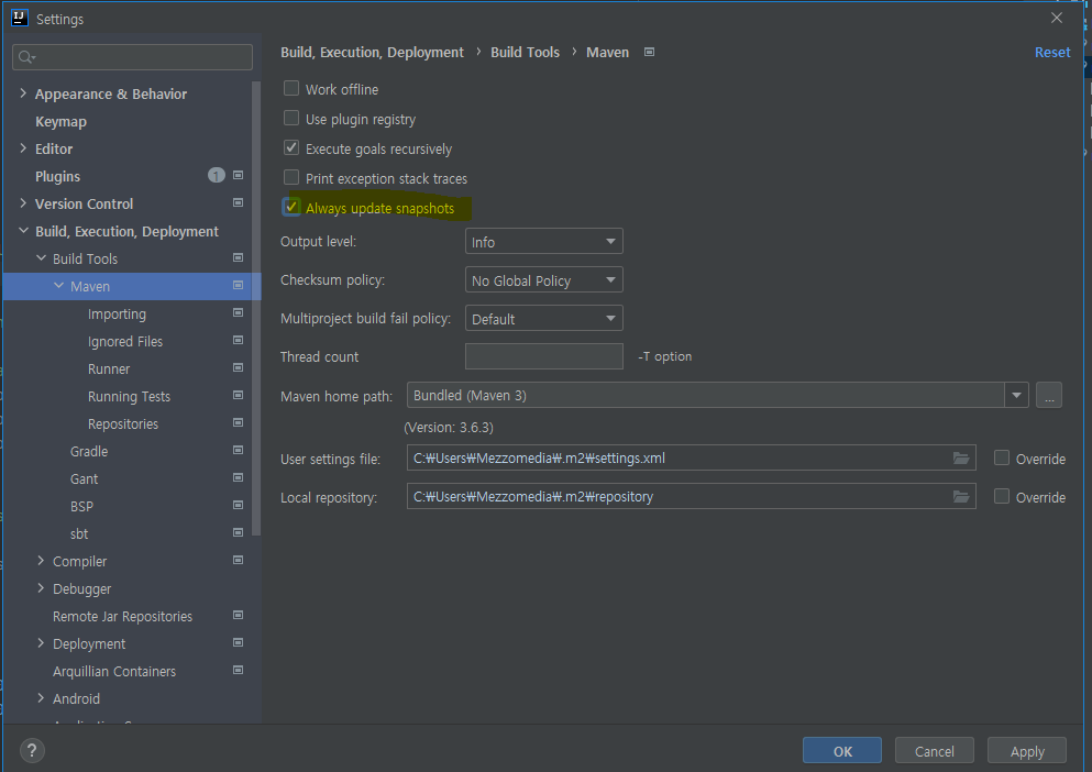 build > build tool > maven > alwas update snapshots > check