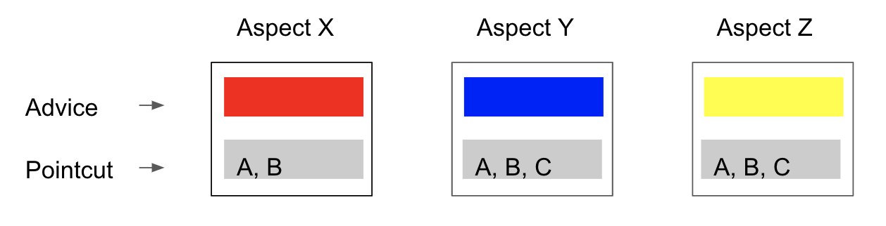 아래 그림을 보면 위의그림에서 흩어진관심사(Concern) 별로 Aspect를 만들어주고 모듈화 시킨것을 볼수 있다.