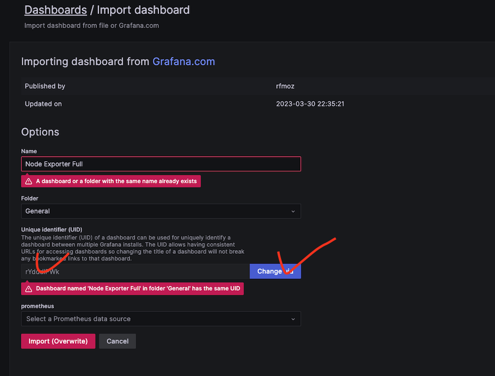 복사한 아이디를 넣어주고 change 를 눌러주면 데이터가 생성된다. 필자는 똑같은 내용이 이미 있기때문에 데시보드가 이미 있다고 나왔다.