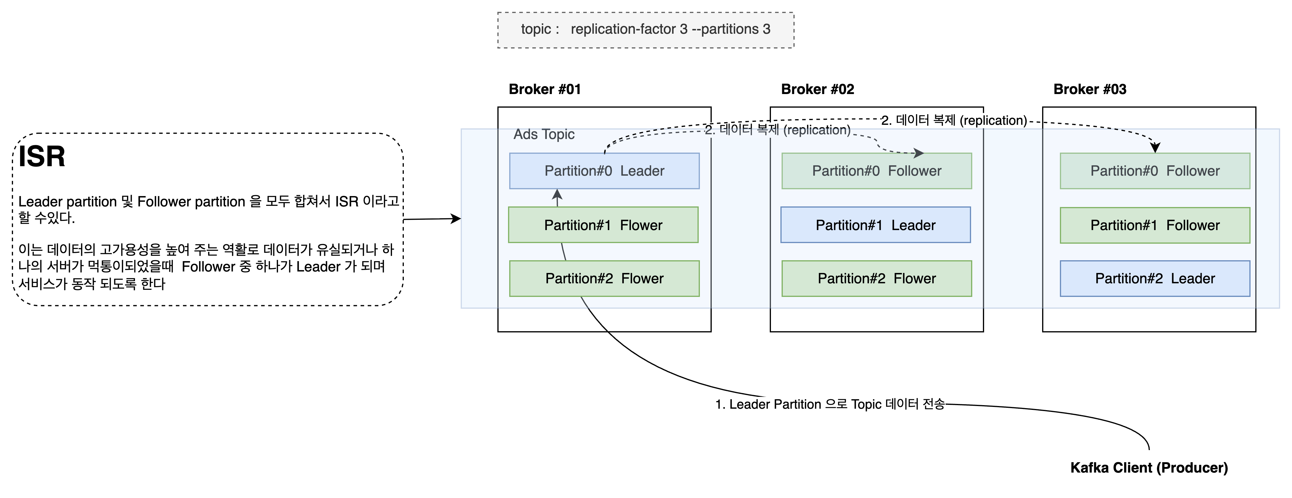 - Lead Partition으로 토픽이 전송된 뒤에 Follower partition인 partition#02, partition#03 으로 복제 된다.