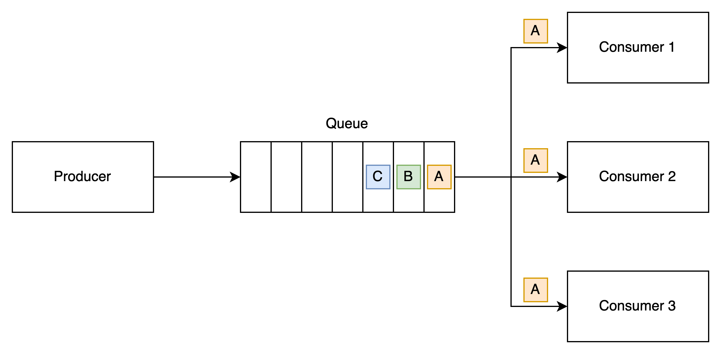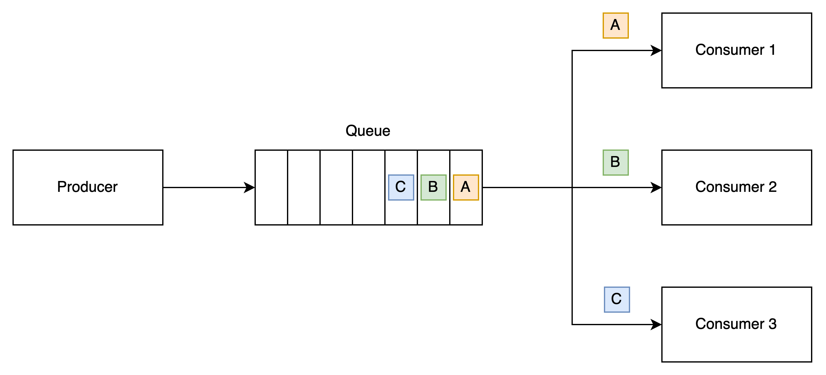 하나의 큐에 여러개의 컨슈머가 할당되어 있는 경우엔 순차적메세지를 가져와 각자 독립적으로 처리가 가능하다.