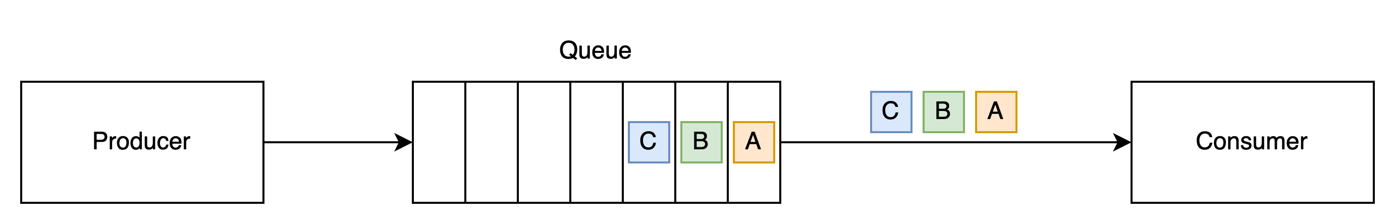 프로듀서에서 발행한 A,B,C 데이터들을 컨슈머에서 하나씩 데이터를 가져와 (FIFO : first in first out) 순차적으로 처리 한다.