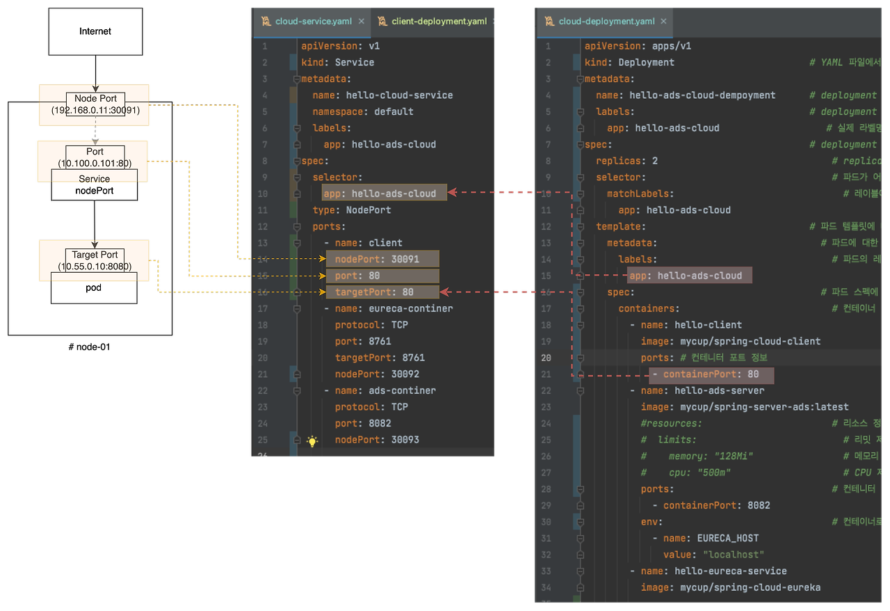 - targetPort : 생략하면 port 의 내용을 승계한다. 실제 pod 에서 사용되는 app의 port 번호이다.