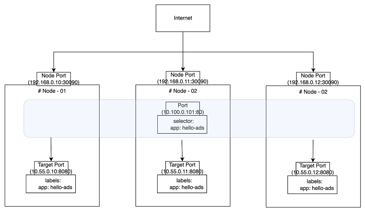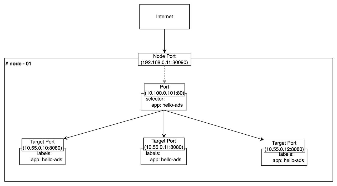 - 노드포트 서비스(NodePortService)로 이동되며 노드포트서비스에의해 어느 Pod로 가게 될지 결정된다.