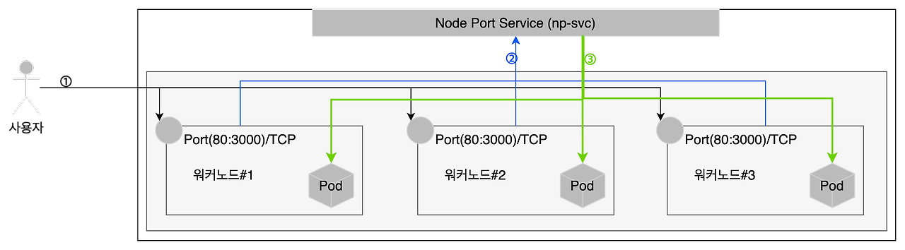 - 사용자가 특정 워커노드#1:3000 번으로 접속한다