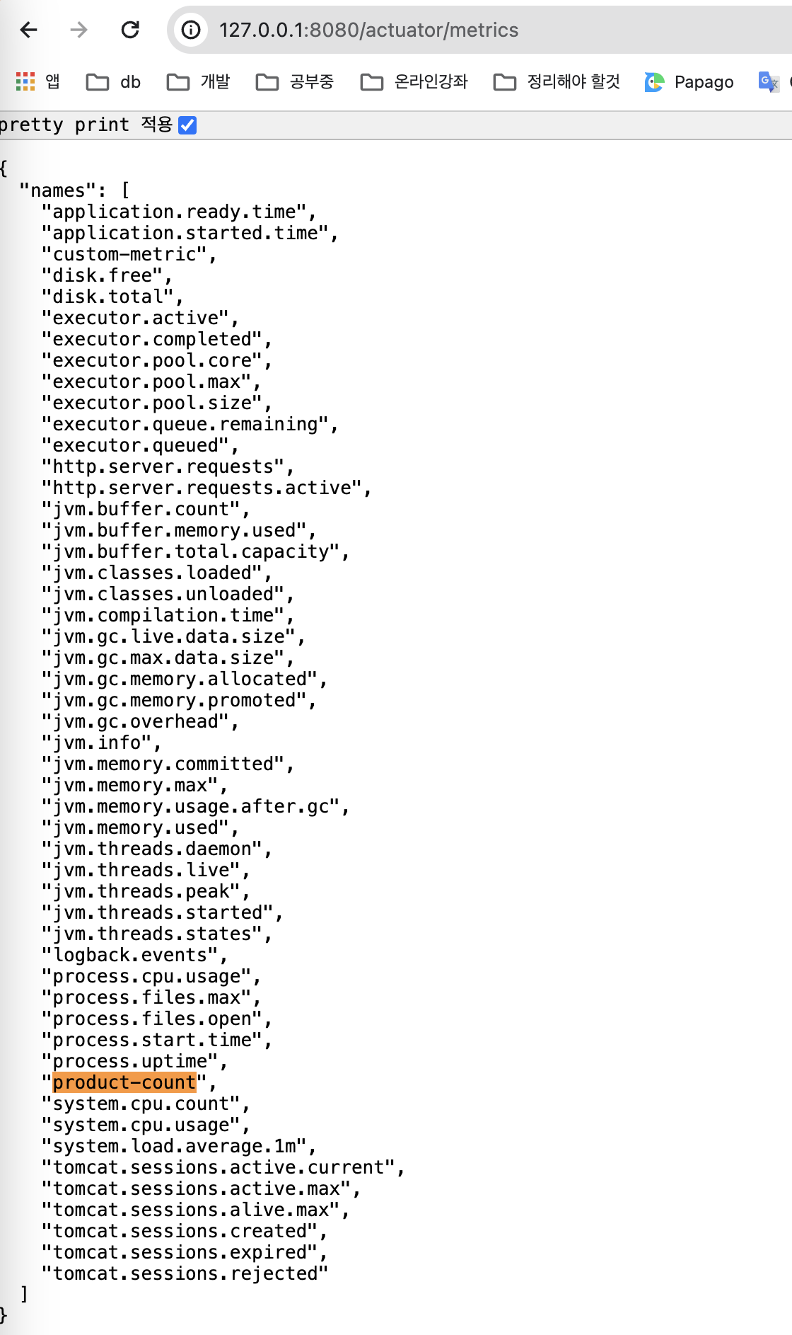 매트릭 지표를 확인 할 수있는 엔드포인트를 제공하는것을 확인 할 수있다. “actuator/metrics” 에 접근해서 새로 생성한 메트릭도 수집중인지 확인하자.