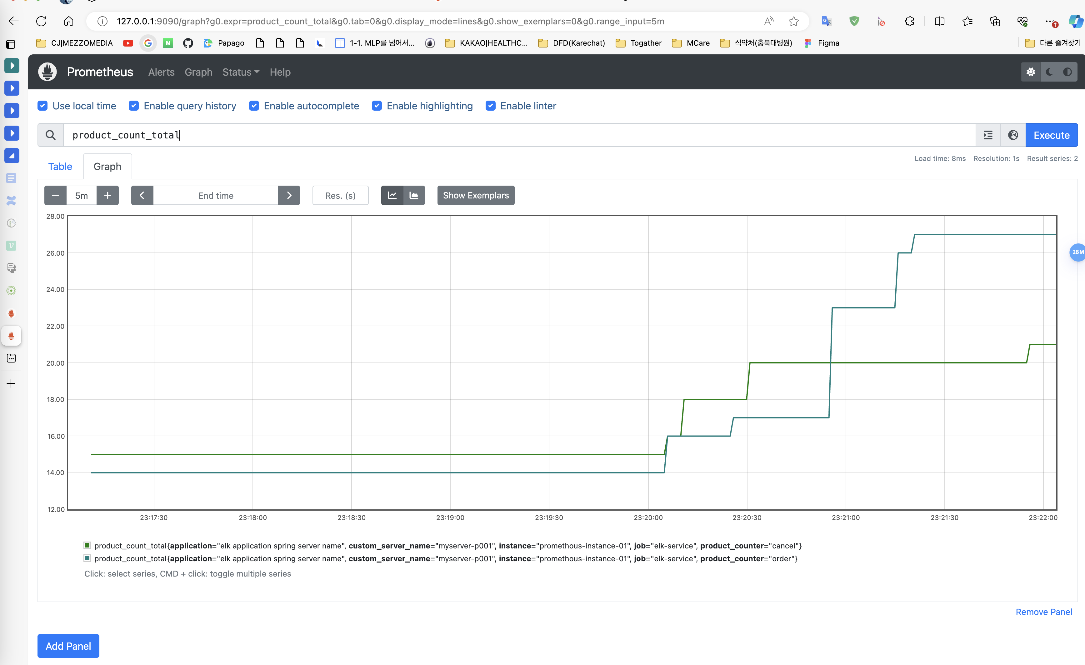 쿼리에 product_count_total 을 입력한 뒤 execute 하고 request count(order, cancel)을 늘려가며 모니터링 해보면 다음과 같이 실시간으로 그래프를 확인 할 수있다.