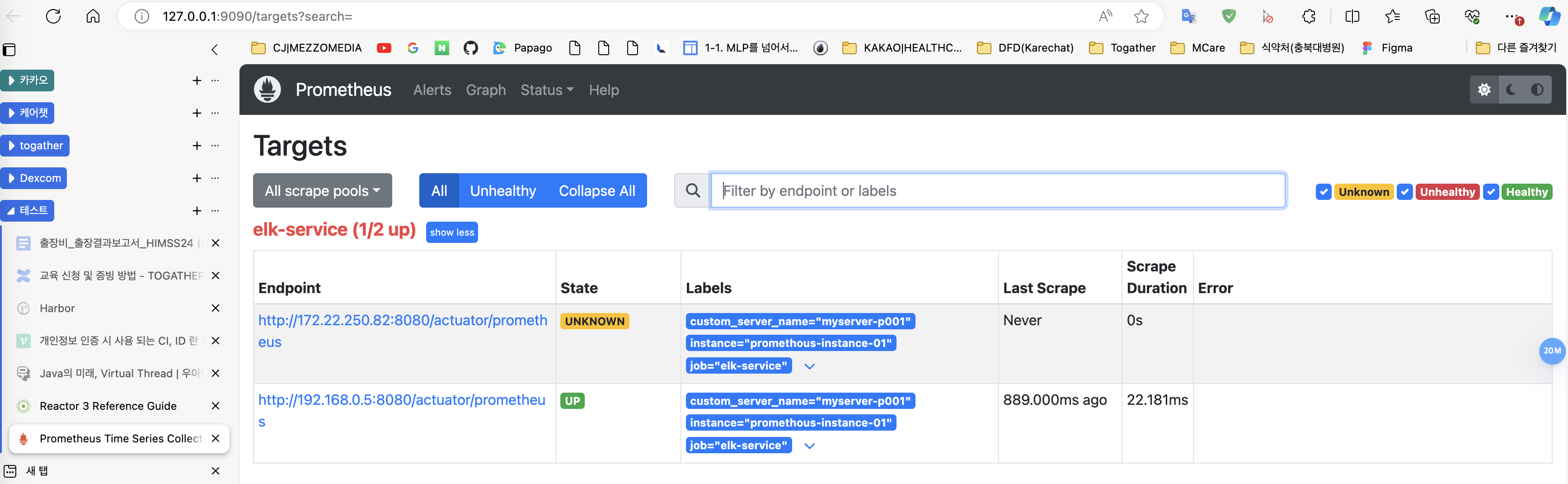 [http://127.0.0.1:9090/targets?search](http://127.0.0.1:9090/targets?search) 에 접속하여 서비스가 정상 동작 하는지 확인한다.