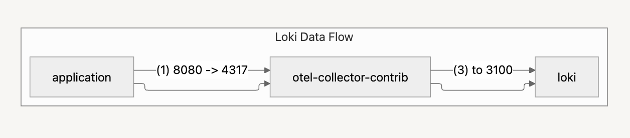 (3) [otelhttp/logs] 로그를 http 프로토콜을 이용하여 http://loki:3100/otlp 로키의 otlp 수신 인드포인트로 전송합니다.