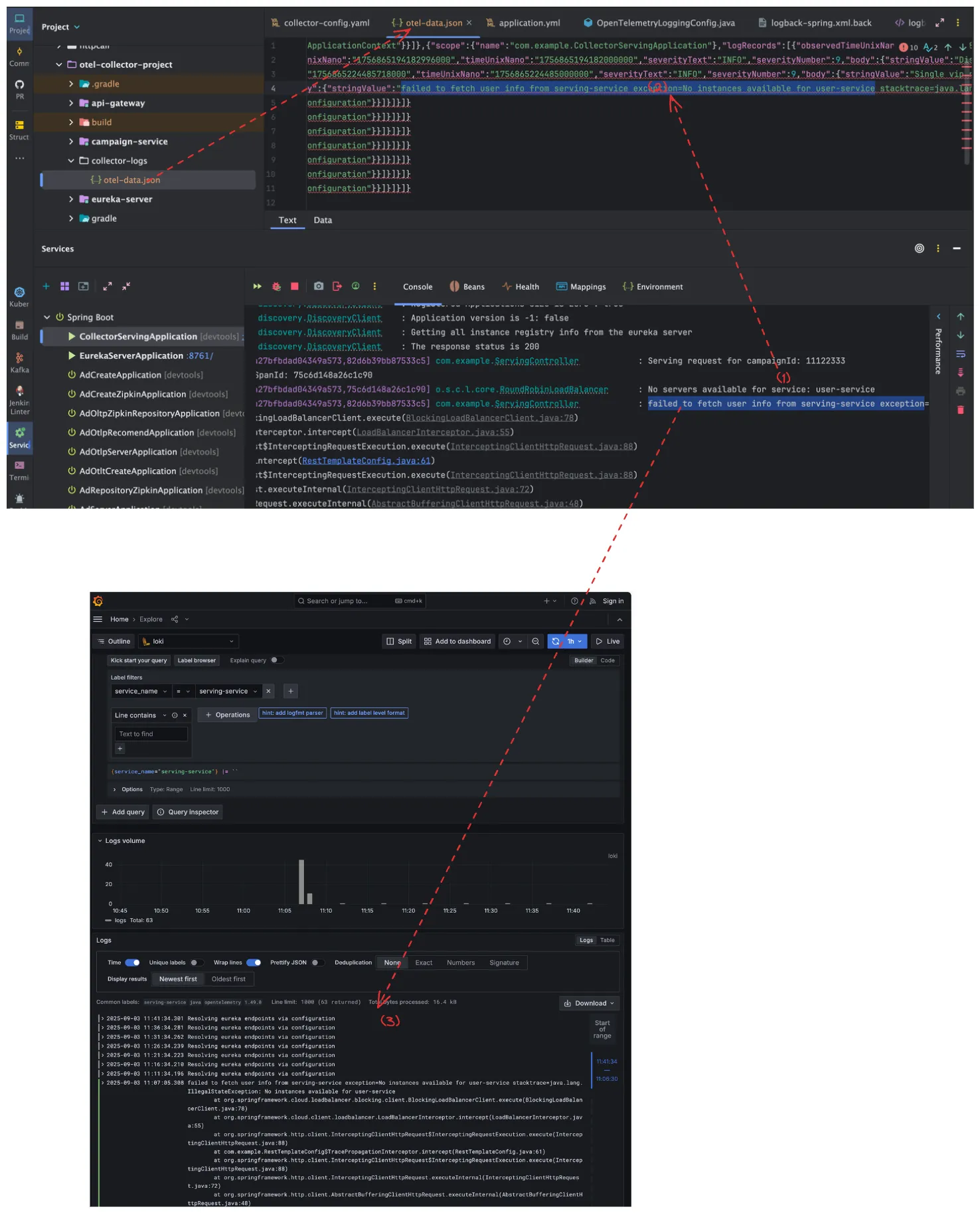 (1)콘솔 화면에서 기록된 내용을 (2) otel-data.json에 기록된걸 확인 할 수 있습니다. 또한 Grafana 에서 Loki 연동후 로그 기록을 살펴보면 (3)번과 같이 콘솔에서 보는 로그를 그라파나에서도 확인 가능합니다.