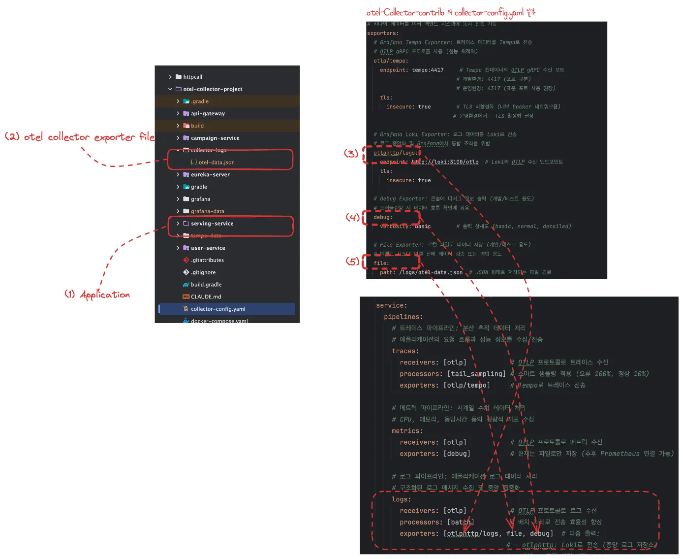 (5) [file] 로그를 지정한 위치의 디렉토리에 otel josn format (otel-data.json)의 형태로 기록되도록 합니다.