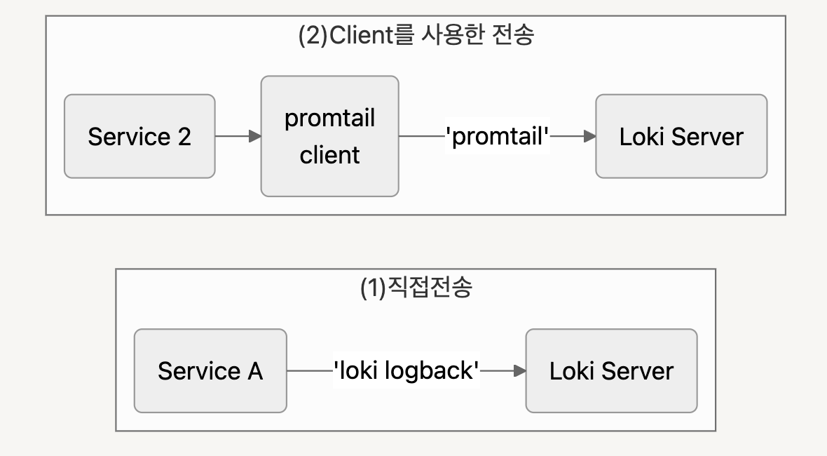 [그림1] - (2)promtail 과 (1)loki log appener 사용 그림