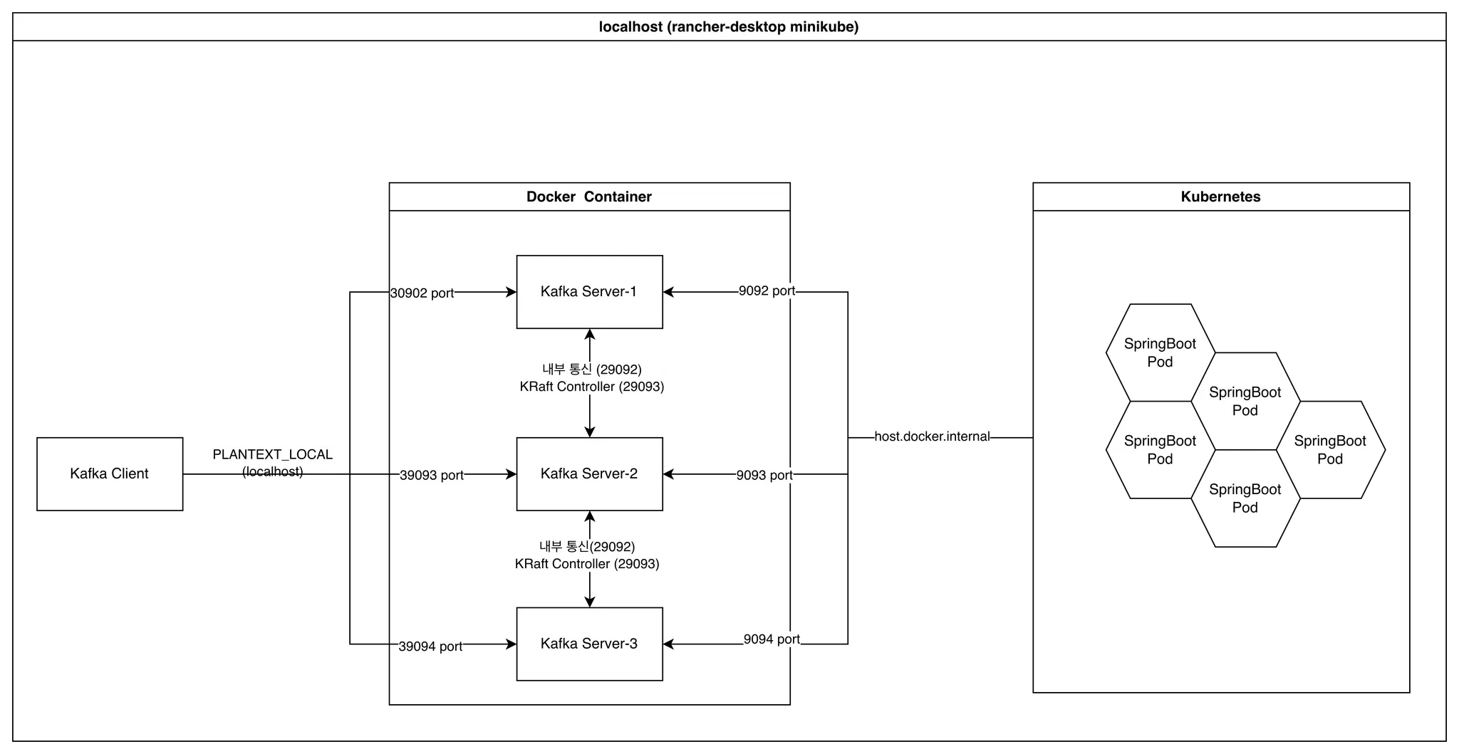 (2)kubernates에 있는 SpringBoot Pod 들은 PLANTEXT_HOST(host.docker.internal) 9092,9093,9094의 포트로 통신한다.