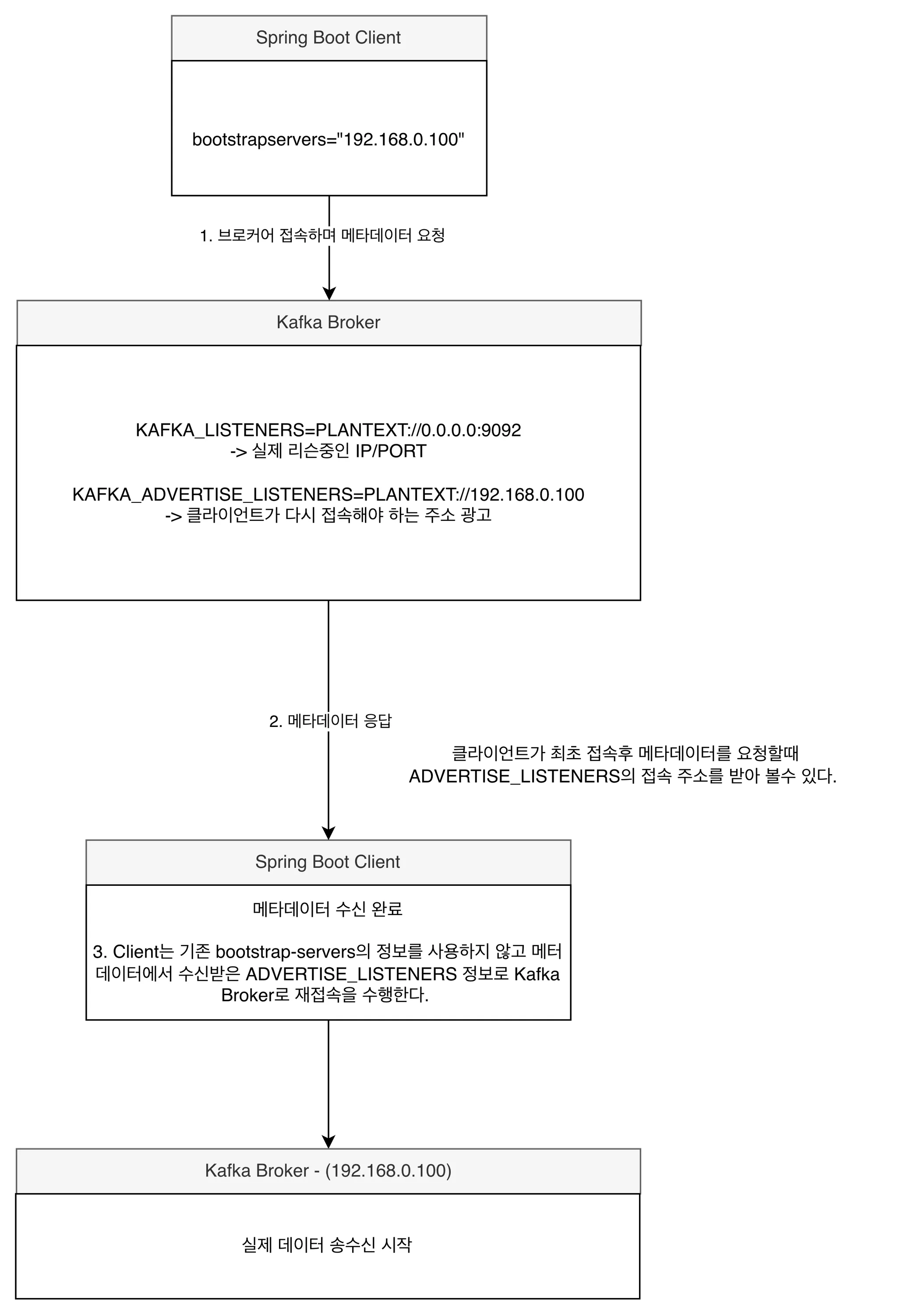 | KAFKA_ADVERTISE_LISTENERS | 클라이언트가 접속해야할 IP/PORT 정보 | 클라이언트에게 어디로 접속하라고 알려주는 경로 |
