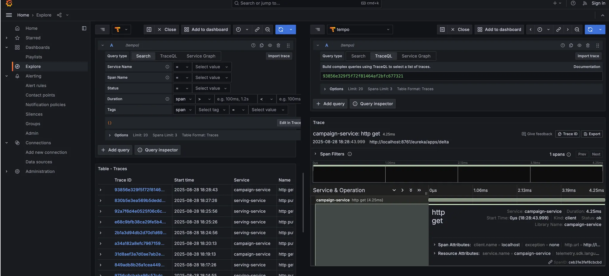 Console 로그에서 발생된 Trace Id를 grafana tempo 의 검색 상에서 확인 할 수 있습니다.