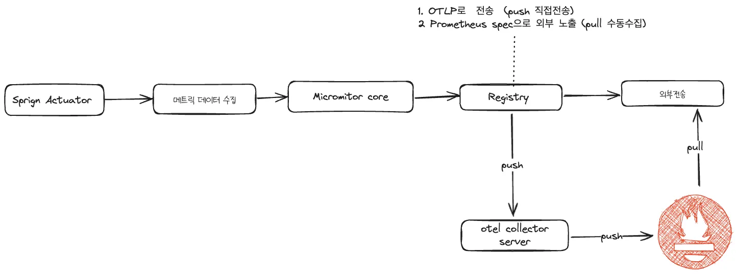 그림으로보면 다음과같이 registry 모듈을 micrometer-registry-olpt를 사용하느냐 혹은 micrometer-registry-prometheus를 사용하느냐에 따라 push 혹은 prometheus가 직접 수동으로 pull 해가는 두가지 방식으로 사용 가능 합니다.